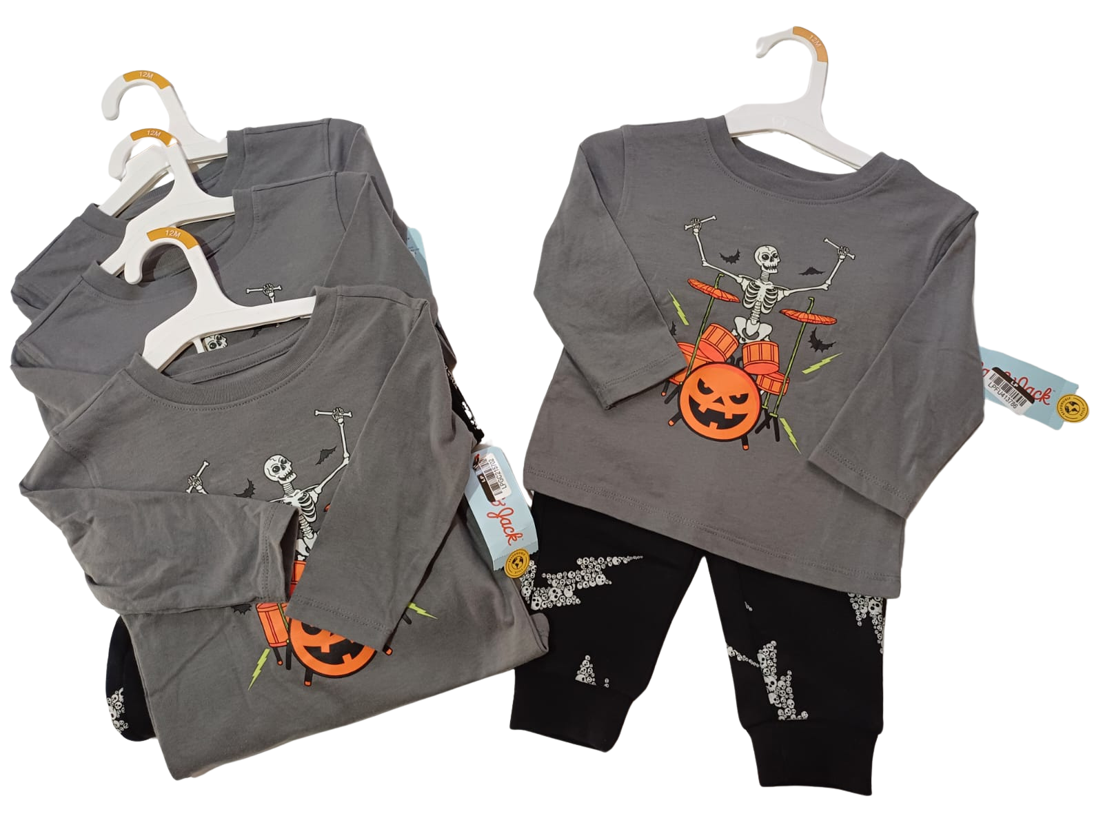 Playera de manga larga gris con estampado de calaverita baterista y pantalón negro con rayos. Tejido suave y cómodo, pretina elástica: perfecto para salir a pedir dulces o para pijamada spooky. 🎃🥁